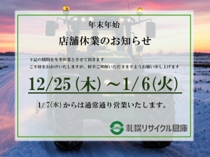 「2025年度年末年始店舗休業のお知らせです。」平素は札幌リサイクル倉庫をご愛顧頂き、誠にありがとうございます。当店では冬季休業日を下記の通
